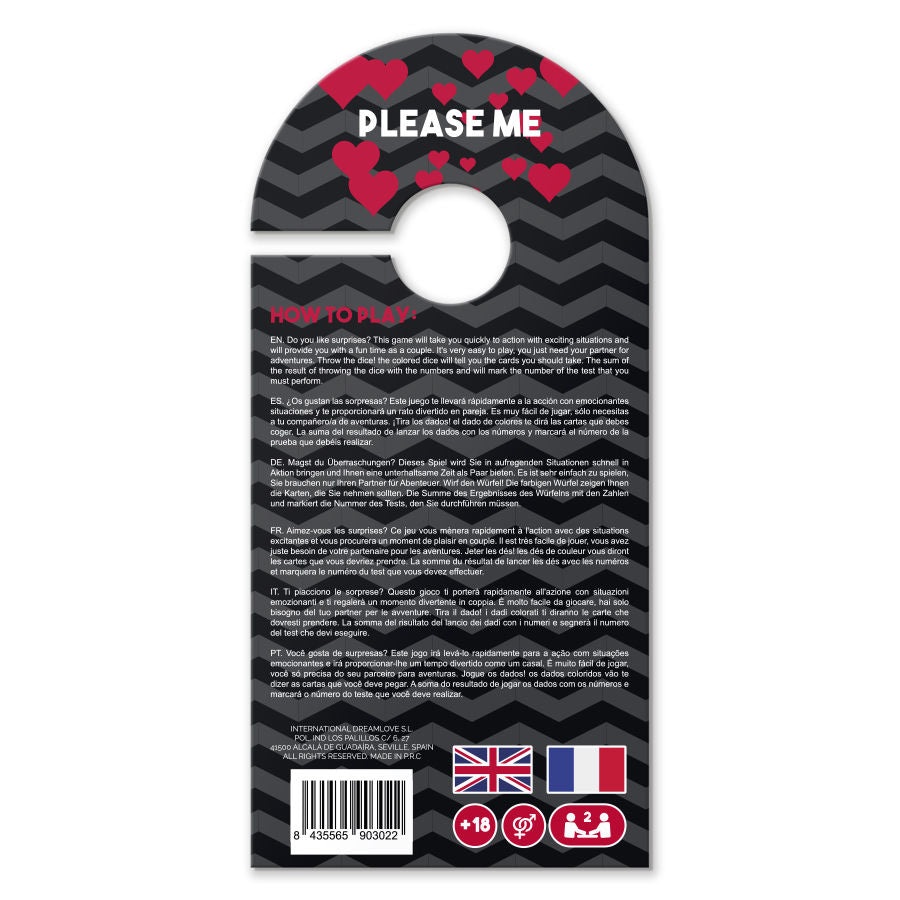 Liker du overraskelser? Dette spillet tar dere raskt til handling med spennende situasjoner og vil gi dere en morsom tid som par. Det er veldig enkelt å spille, dere trenger bare eventyrpartneren din. Kast terningen! De fargede terningene vil fortelle deg kortene dere skal ta. Resultatet av å kaste terningen med tallene vil markere nummeret på testen dere må kaste.